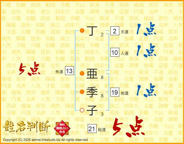 生活面を象徴する運勢です。外部から受ける影響力を表し、結婚運、家庭運や職場、環境への順応性を表します。総運から人運を引いた画数。姓や名が1文字の場合を除く。