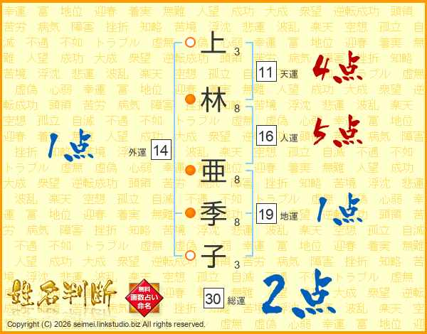 上(3画)林(8画) 亜(8画)季(8画)子(3画)
