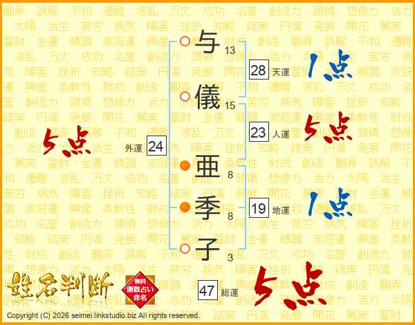 与儀亜季子さんの総運は47画の5点!