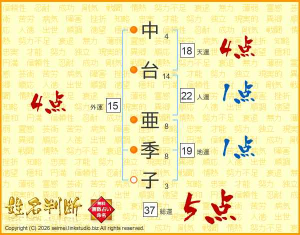 中(4画)台(14画) 亜(8画)季(8画)子(3画)