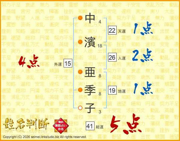 中(4画)濱(18画) 亜(8画)季(8画)子(3画)
