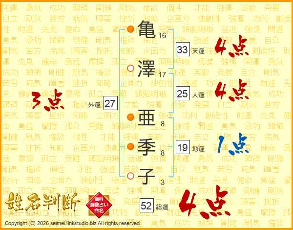 亀(16画)澤(17画) 亜(8画)季(8画)子(3画)