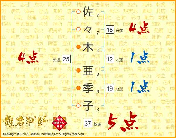 佐々木亜季子さんの総運は37画の5点!