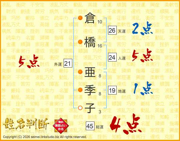倉橋亜季子さんの総運は45画の4点!
