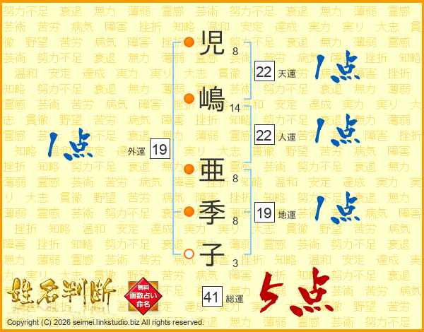 児嶋亜季子さんの総運は41画の5点!