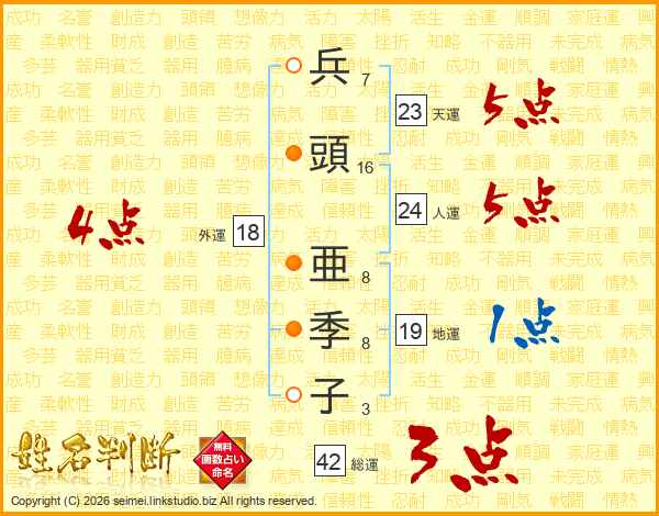兵(7画)頭(16画) 亜(8画)季(8画)子(3画)