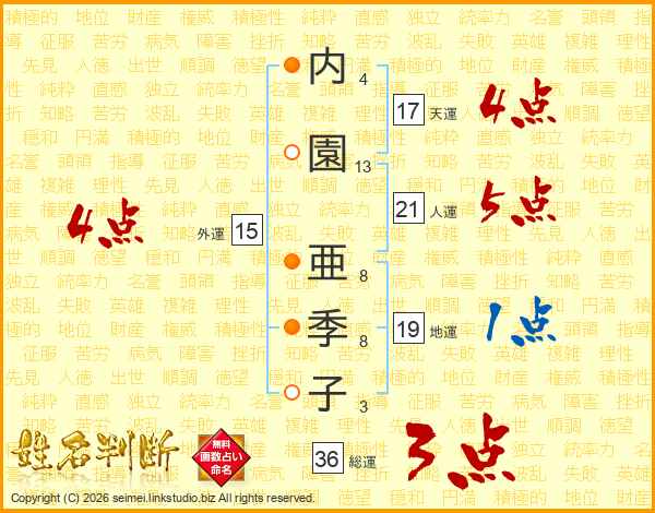内(4画)園(13画) 亜(8画)季(8画)子(3画)