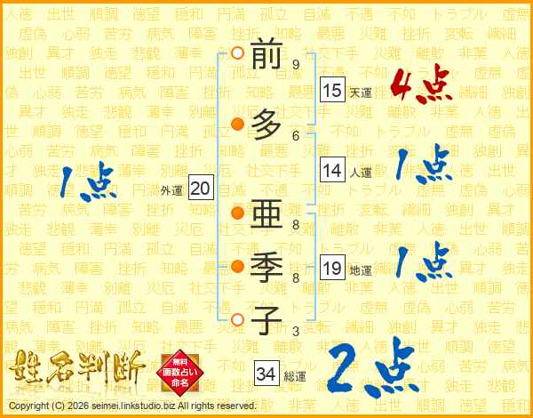 前(9画)多(6画) 亜(8画)季(8画)子(3画)