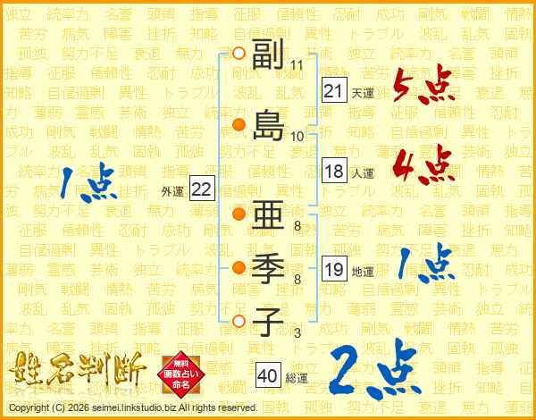 副(11画)島(10画) 亜(8画)季(8画)子(3画)