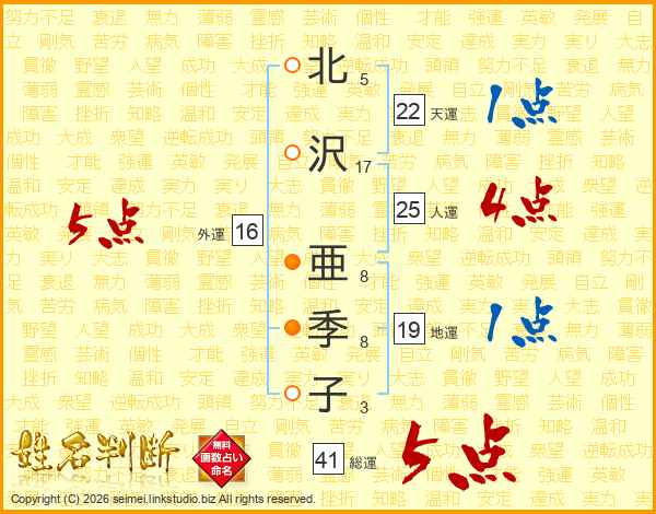 北(5画)沢(17画) 亜(8画)季(8画)子(3画)