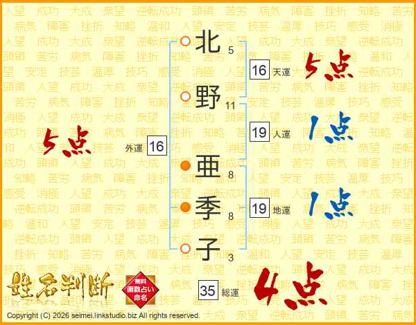 北野亜季子さんの外運は16画の5点!