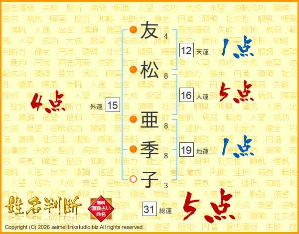 友(4画)松(8画) 亜(8画)季(8画)子(3画)