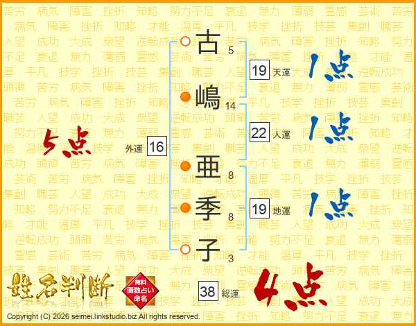 古(5画)嶋(14画) 亜(8画)季(8画)子(3画)