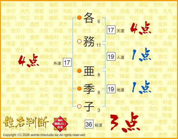 各(6画)務(11画) 亜(8画)季(8画)子(3画)