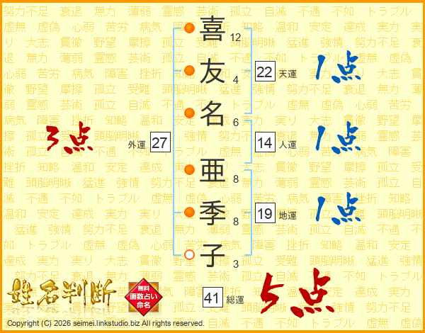 喜(12画)友(4画)名(6画) 亜(8画)季(8画)子(3画)
