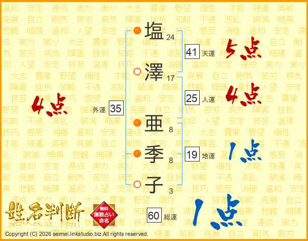 塩(24画)澤(17画) 亜(8画)季(8画)子(3画)