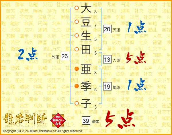 大(3画)豆(7画)生(5画)田(5画) 亜(8画)季(8画)子(3画)