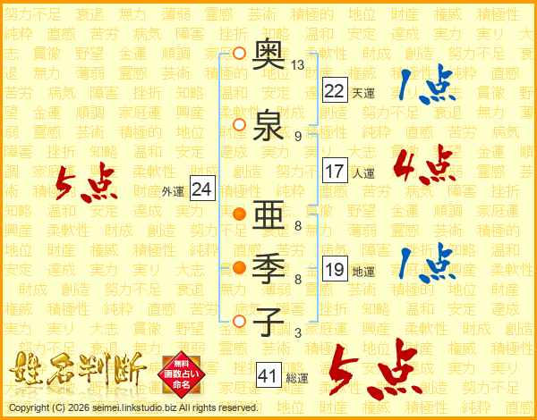 奥(13画)泉(9画) 亜(8画)季(8画)子(3画)