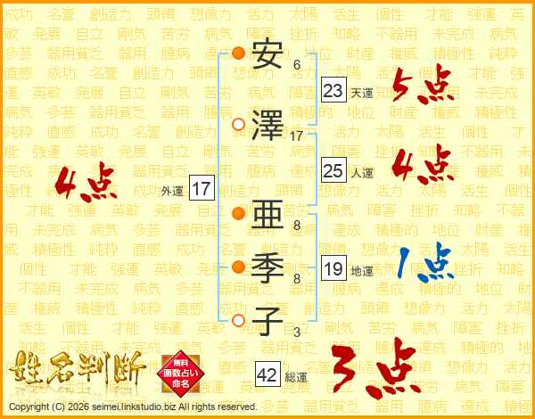 安(6画)澤(17画) 亜(8画)季(8画)子(3画)