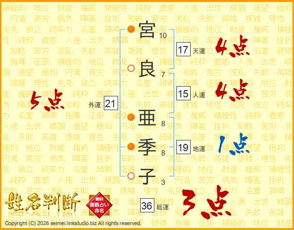 宮(10画)良(7画) 亜(8画)季(8画)子(3画)
