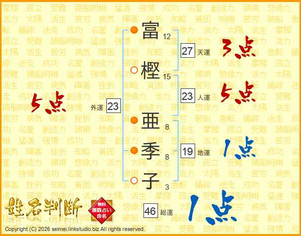 富(12画)樫(15画) 亜(8画)季(8画)子(3画)