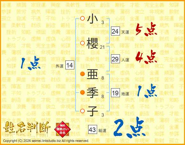 小(3画)櫻(21画) 亜(8画)季(8画)子(3画)