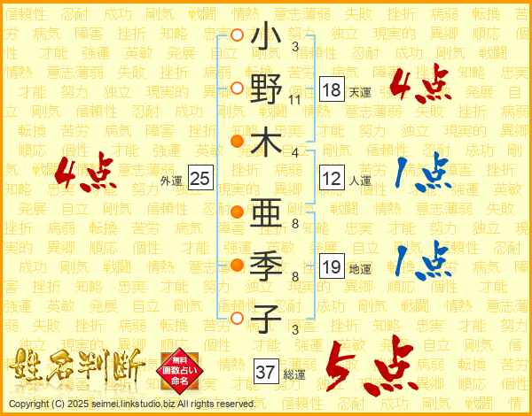 小(3画)野(11画)木(4画) 亜(8画)季(8画)子(3画)