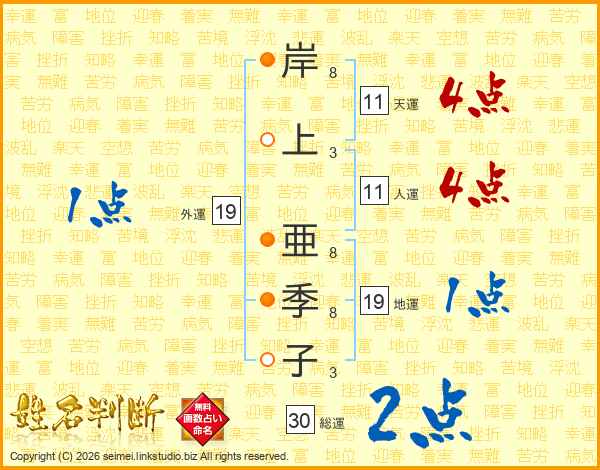 岸(8画)上(3画) 亜(8画)季(8画)子(3画)