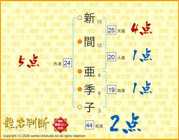 新(13画)間(12画) 亜(8画)季(8画)子(3画)