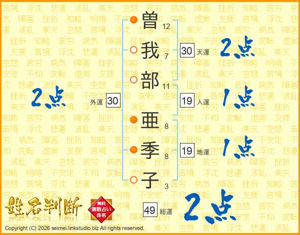 曽(12画)我(7画)部(11画) 亜(8画)季(8画)子(3画)