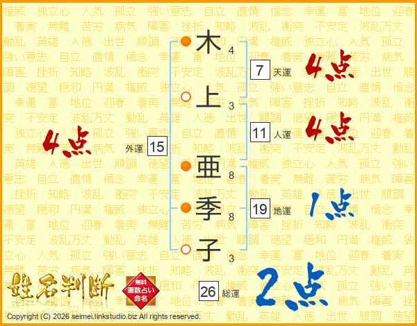木(4画)上(3画) 亜(8画)季(8画)子(3画)