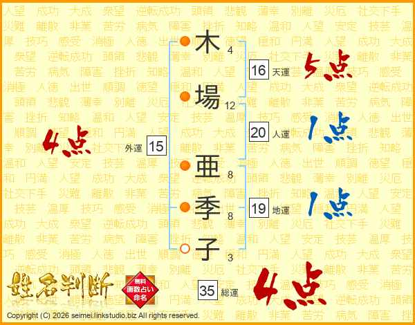 木(4画)場(12画) 亜(8画)季(8画)子(3画)