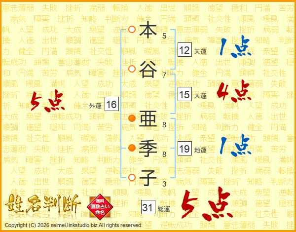 本(5画)谷(7画) 亜(8画)季(8画)子(3画)