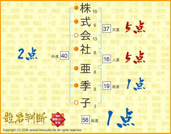 株式会社亜季子さんの天運は37画の5点!