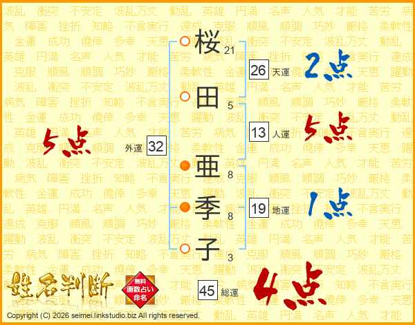 桜田亜季子さんの外運は32画の5点!