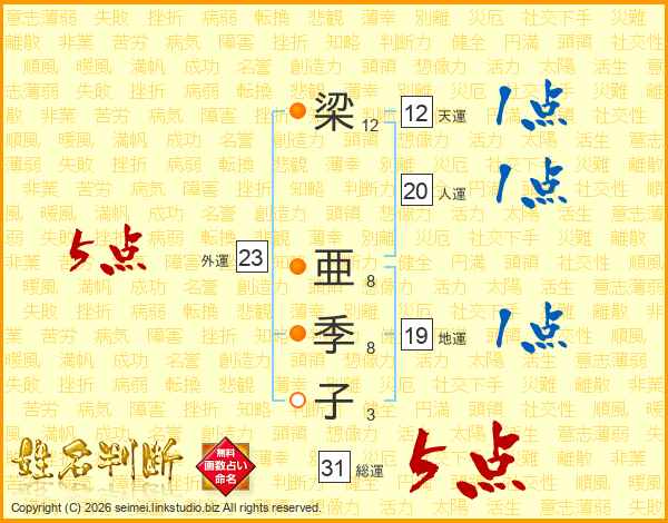 梁亜季子さんの総運は31画の5点!