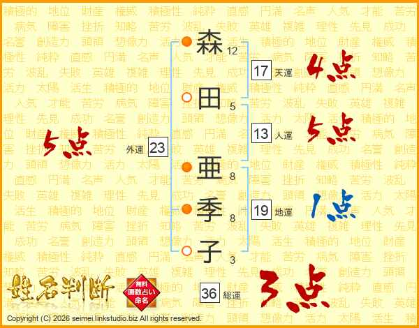 森(12画)田(5画) 亜(8画)季(8画)子(3画)
