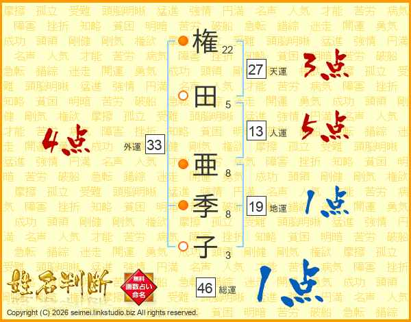権(22画)田(5画) 亜(8画)季(8画)子(3画)