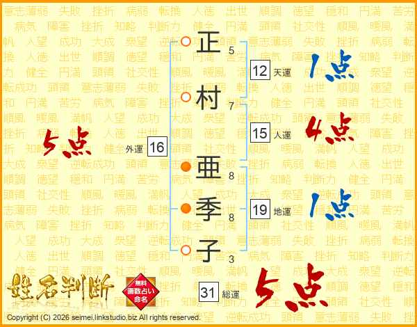 正(5画)村(7画) 亜(8画)季(8画)子(3画)