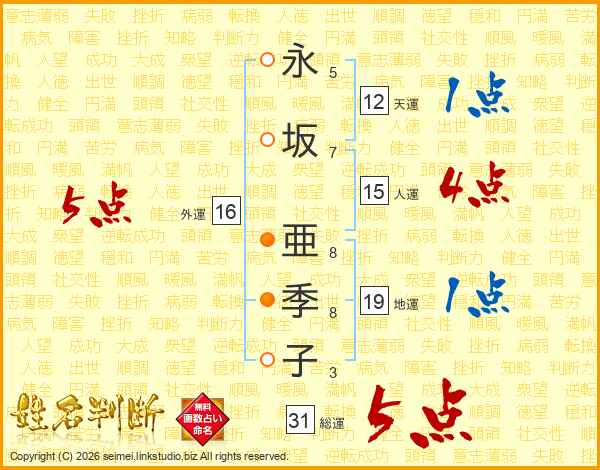 永(5画)坂(7画) 亜(8画)季(8画)子(3画)