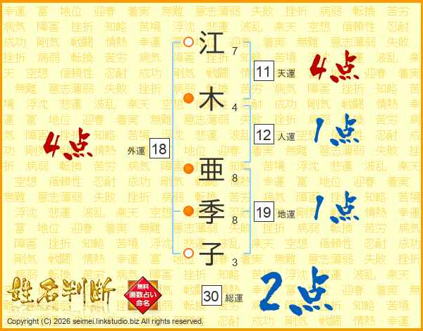 江(7画)木(4画) 亜(8画)季(8画)子(3画)