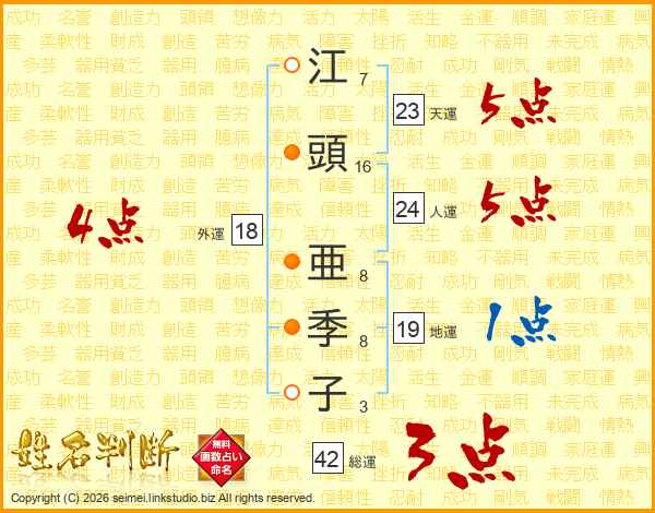江(7画)頭(16画) 亜(8画)季(8画)子(3画)