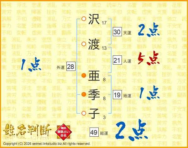 沢(17画)渡(13画) 亜(8画)季(8画)子(3画)