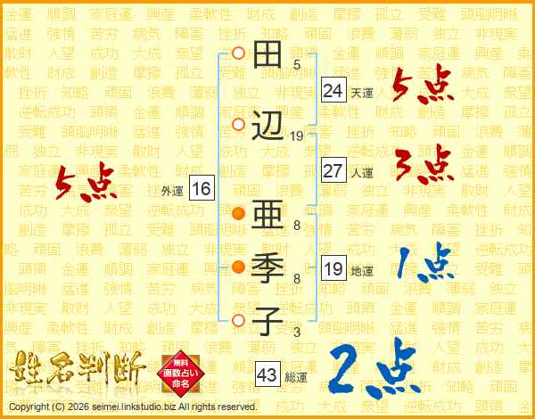 田(5画)辺(19画) 亜(8画)季(8画)子(3画)