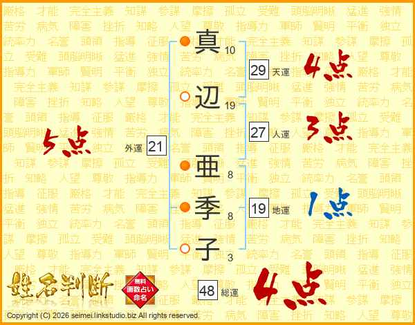真(10画)辺(19画) 亜(8画)季(8画)子(3画)