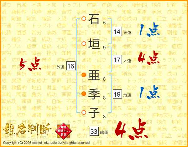 石垣亜季子さんの総運は33画の4点!