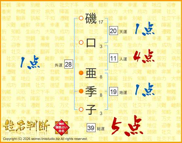 磯(17画)口(3画) 亜(8画)季(8画)子(3画)