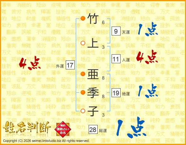 竹(6画)上(3画) 亜(8画)季(8画)子(3画)