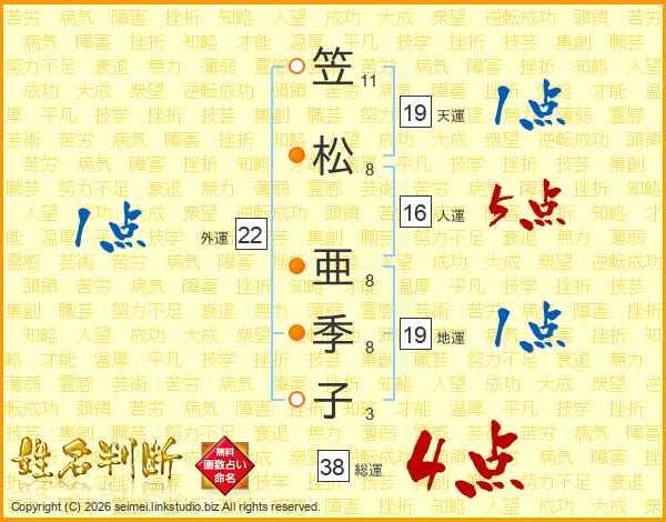 笠(11画)松(8画) 亜(8画)季(8画)子(3画)