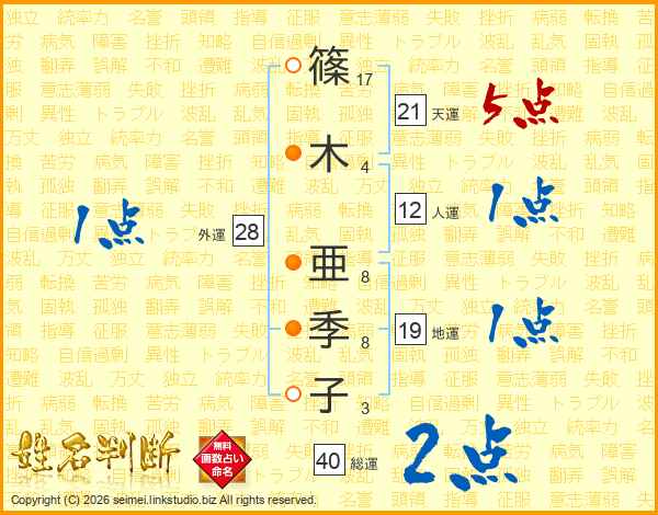 篠(17画)木(4画) 亜(8画)季(8画)子(3画)